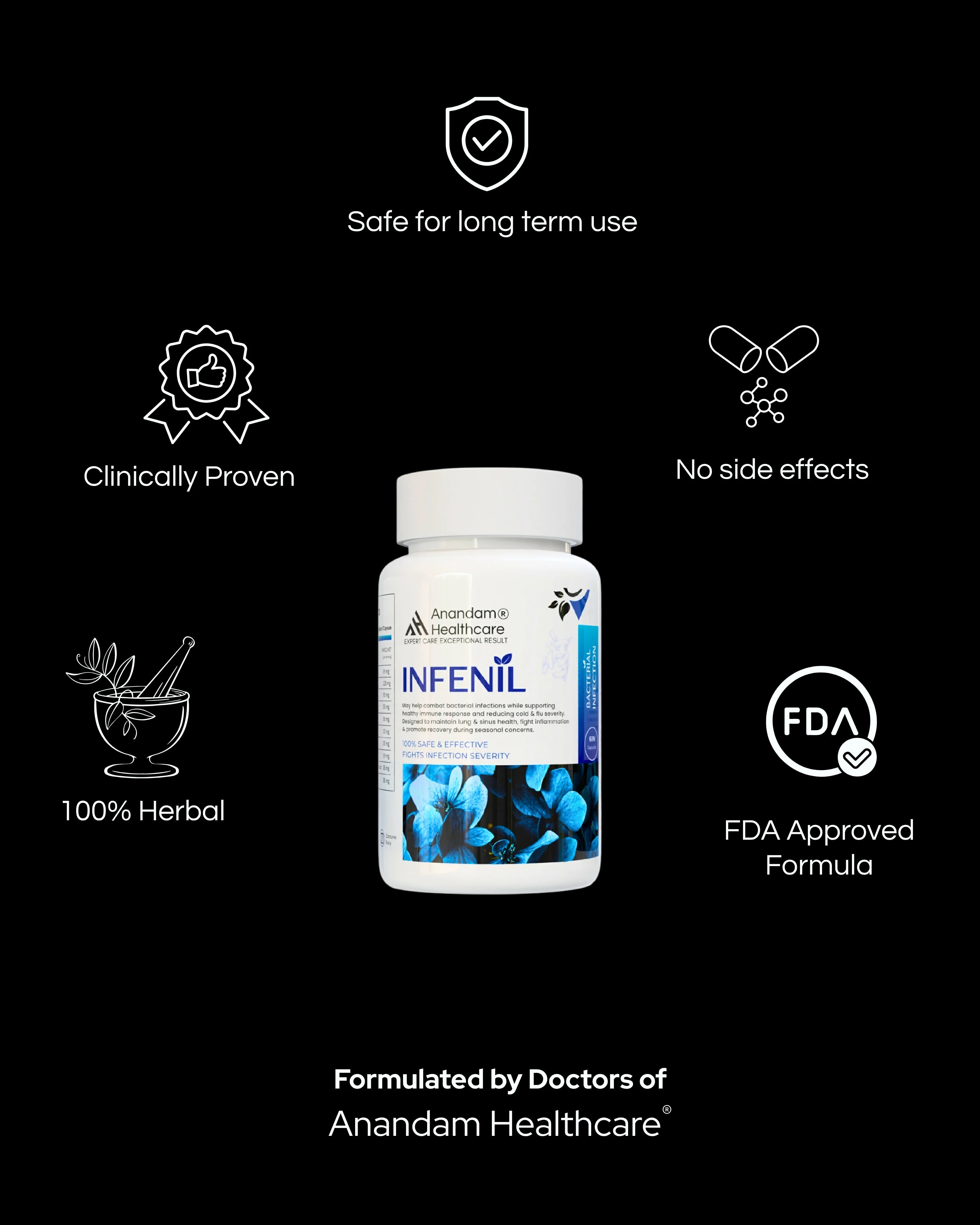 आनंदम हेल्थकेयर का इन्फेनिल एक प्रीमियम आयुर्वेदिक फ़ॉर्मूला है जो बैक्टीरिया के संक्रमण से लड़ने, सर्दी-ज़ुकाम की गंभीरता को कम करने, एलर्जी से राहत दिलाने, बार-बार होने वाले संक्रमणों को रोकने, फेफड़ों और साइनस के स्वास्थ्य को बेहतर बनाने और सूजन से सुरक्षित रूप से निपटने के लिए बनाया गया है। जड़ी-बूटियों और खनिजों के एक शक्तिशाली मिश्रण के साथ, इन्फेनिल आपके शरीर की सुरक्षा को मज़बूत करता है और श्वसन स्वास्थ्य को बढ़ावा देता है।