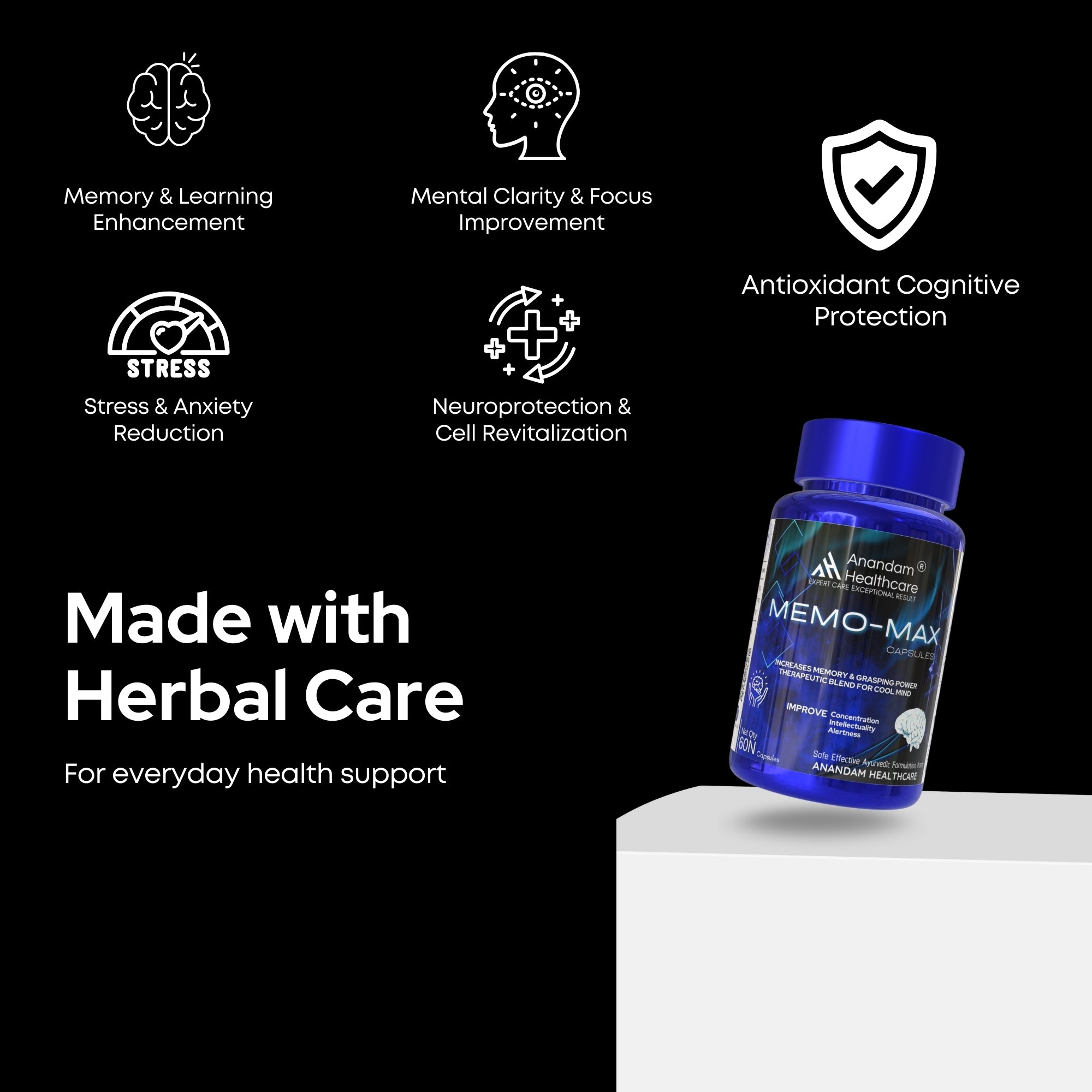 The inclusion of Manduk Parni helps manage cortisol levels—the stress hormone that causes "brain fog." By neutralizing oxidative stress in the cerebral tissue, MEMO-MAX maintains mental clarity even during high-pressure tasks or long work hours.