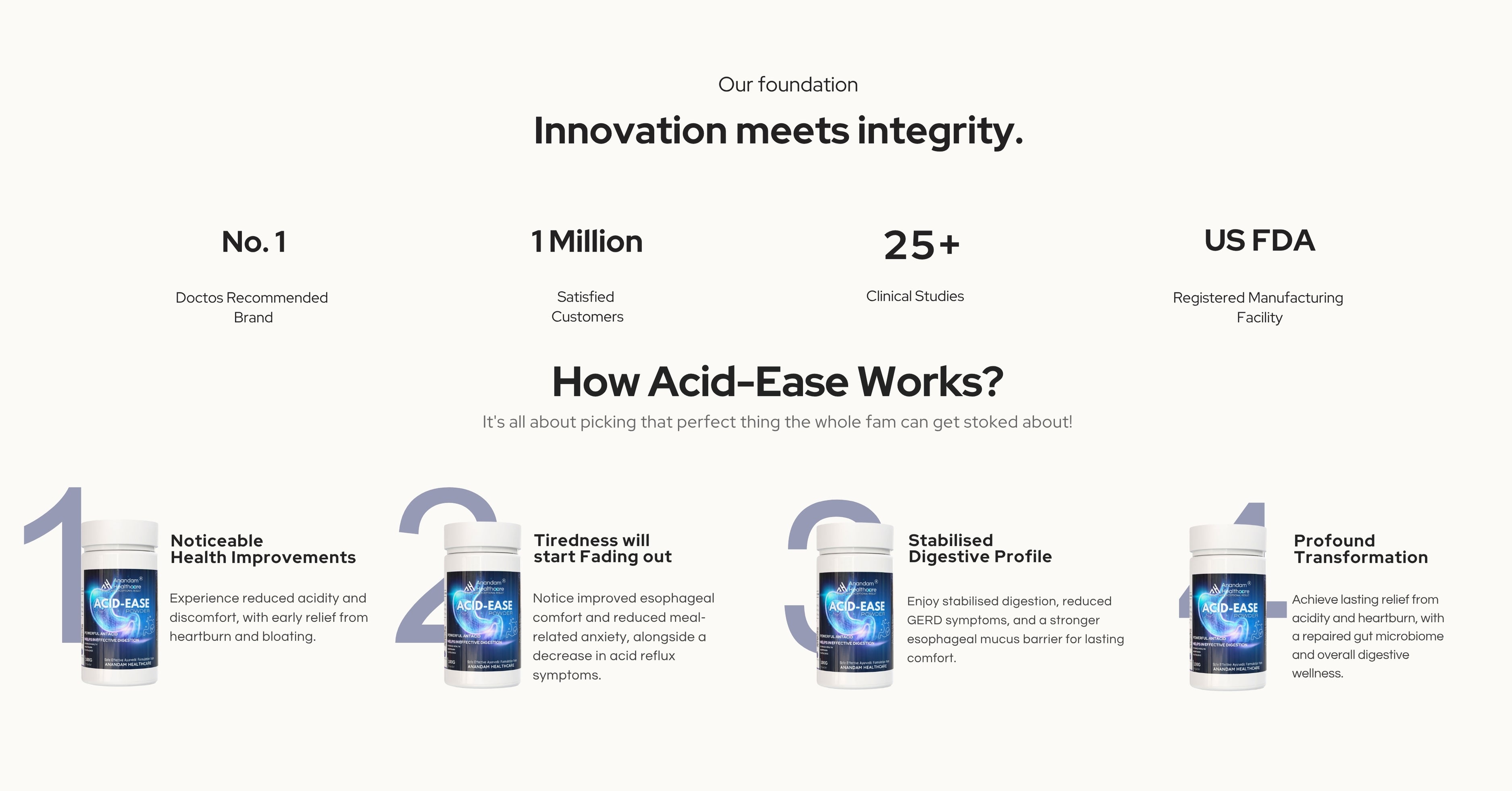 एसिड ईज़, 15 से ज़्यादा नैदानिक परीक्षणों द्वारा समर्थित, पाचन संबंधी परेशानियों के लिए एक वैज्ञानिक रूप से प्रमाणित समाधान है। प्रतिभागियों ने सीने की जलन में 79%, एसिड रिफ्लक्स में 80%, और गैस और सूजन में 77% की कमी दर्ज की है।