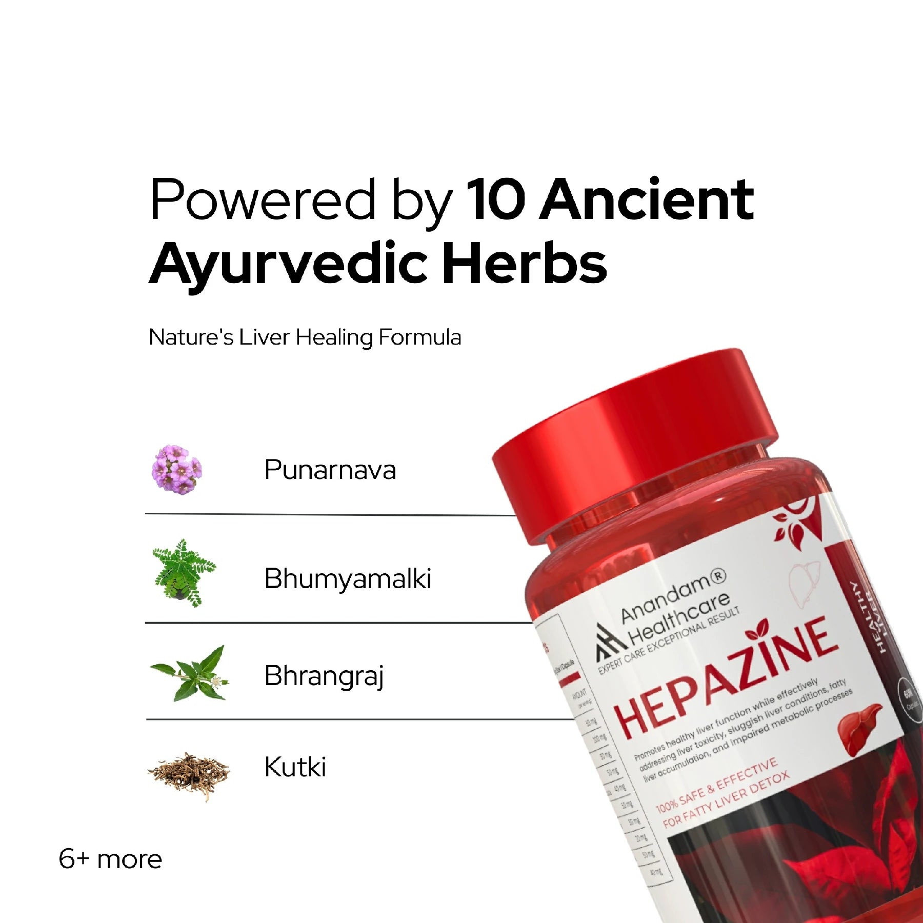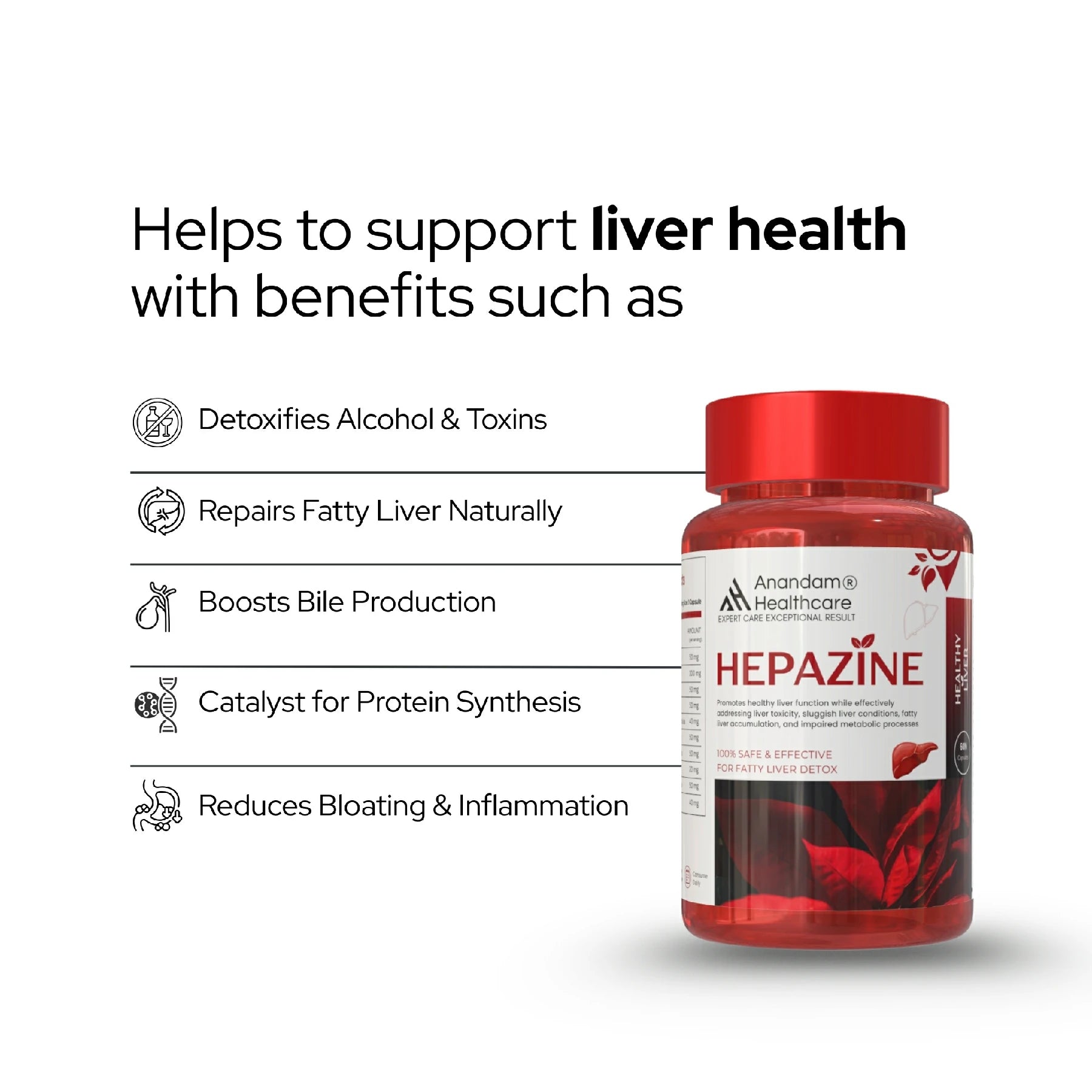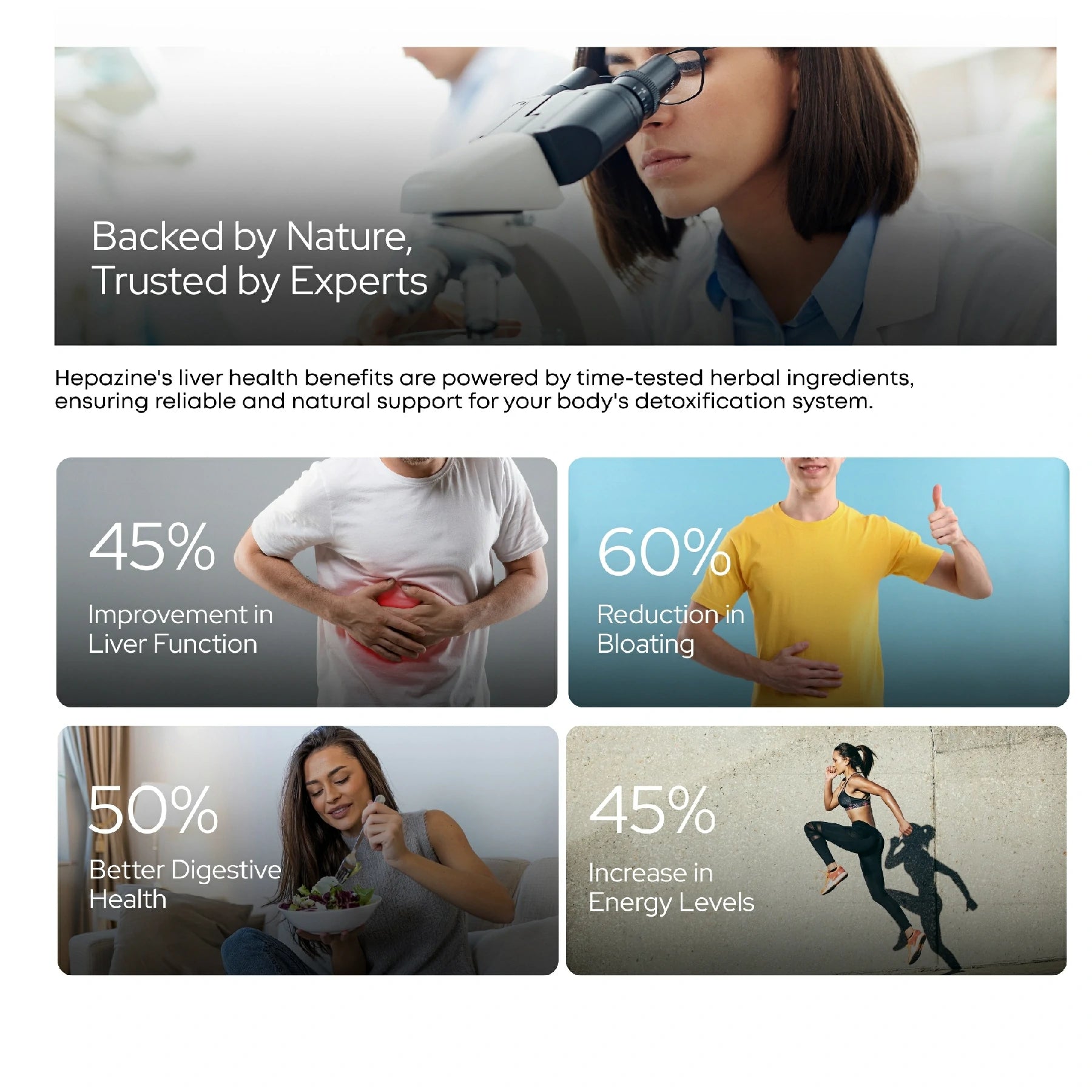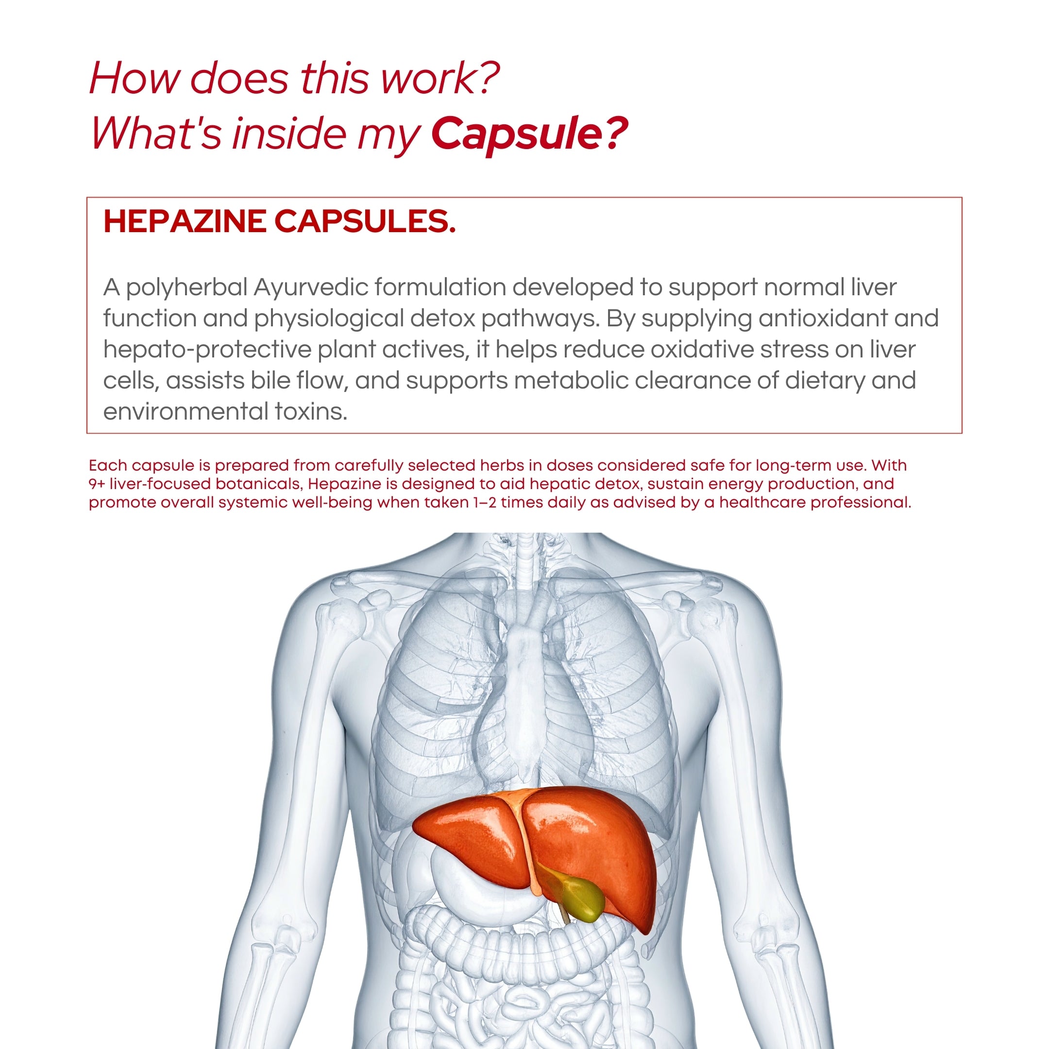 Hepazine supports total liver detoxification, aids in repairing fatty liver, lowers elevated liver enzymes (SGOT/SGPT), and significantly boosts systemic energy and metabolism by improving nutrient processing.