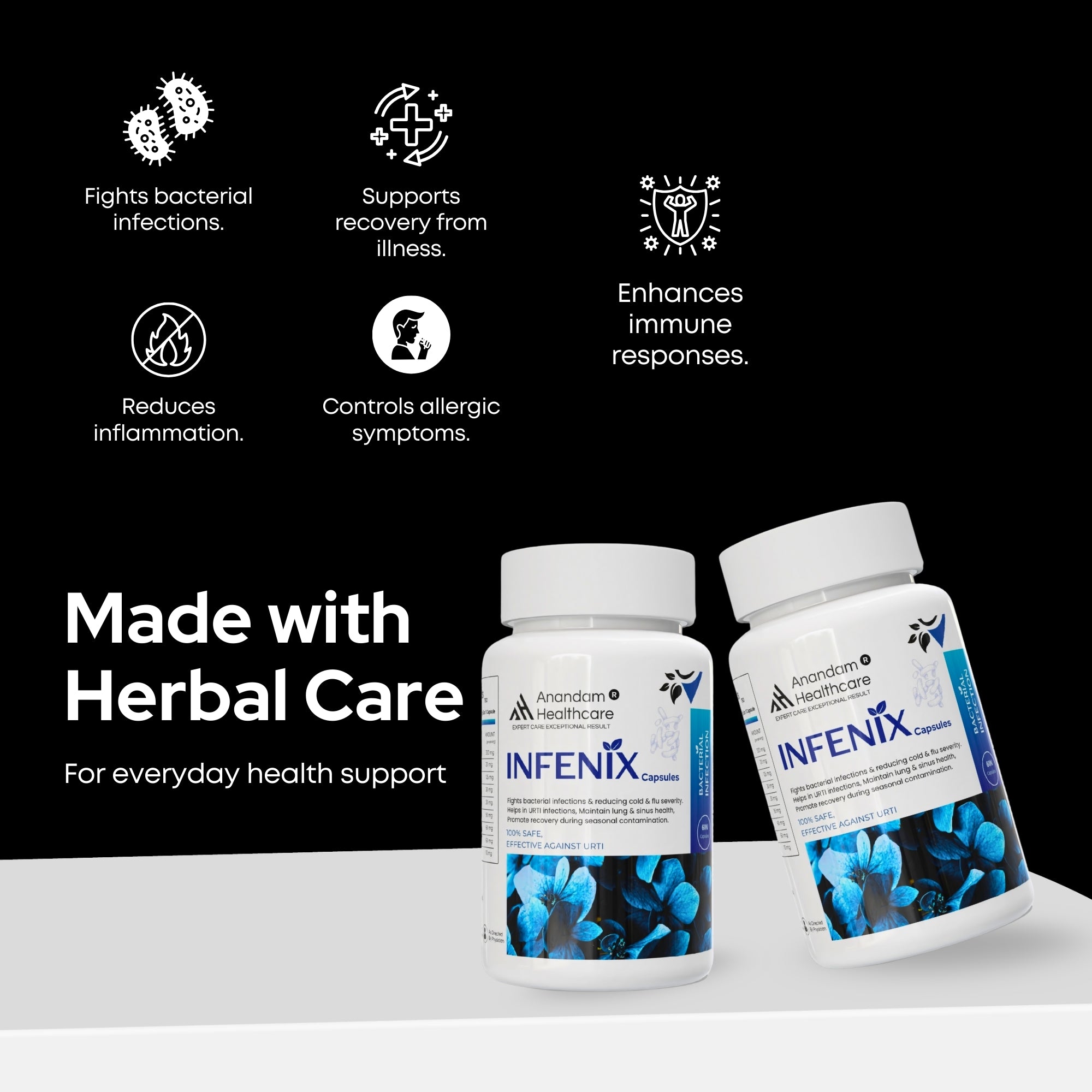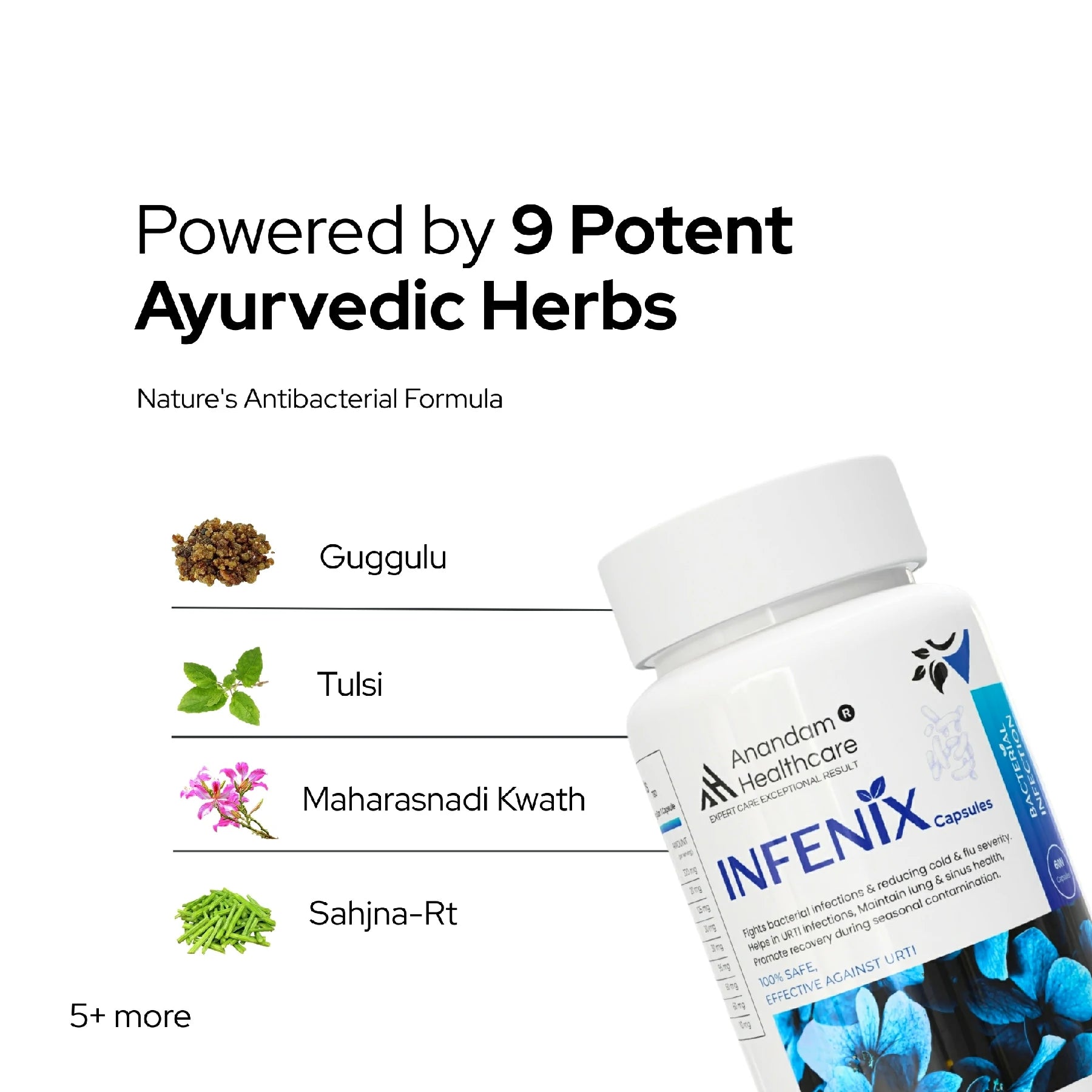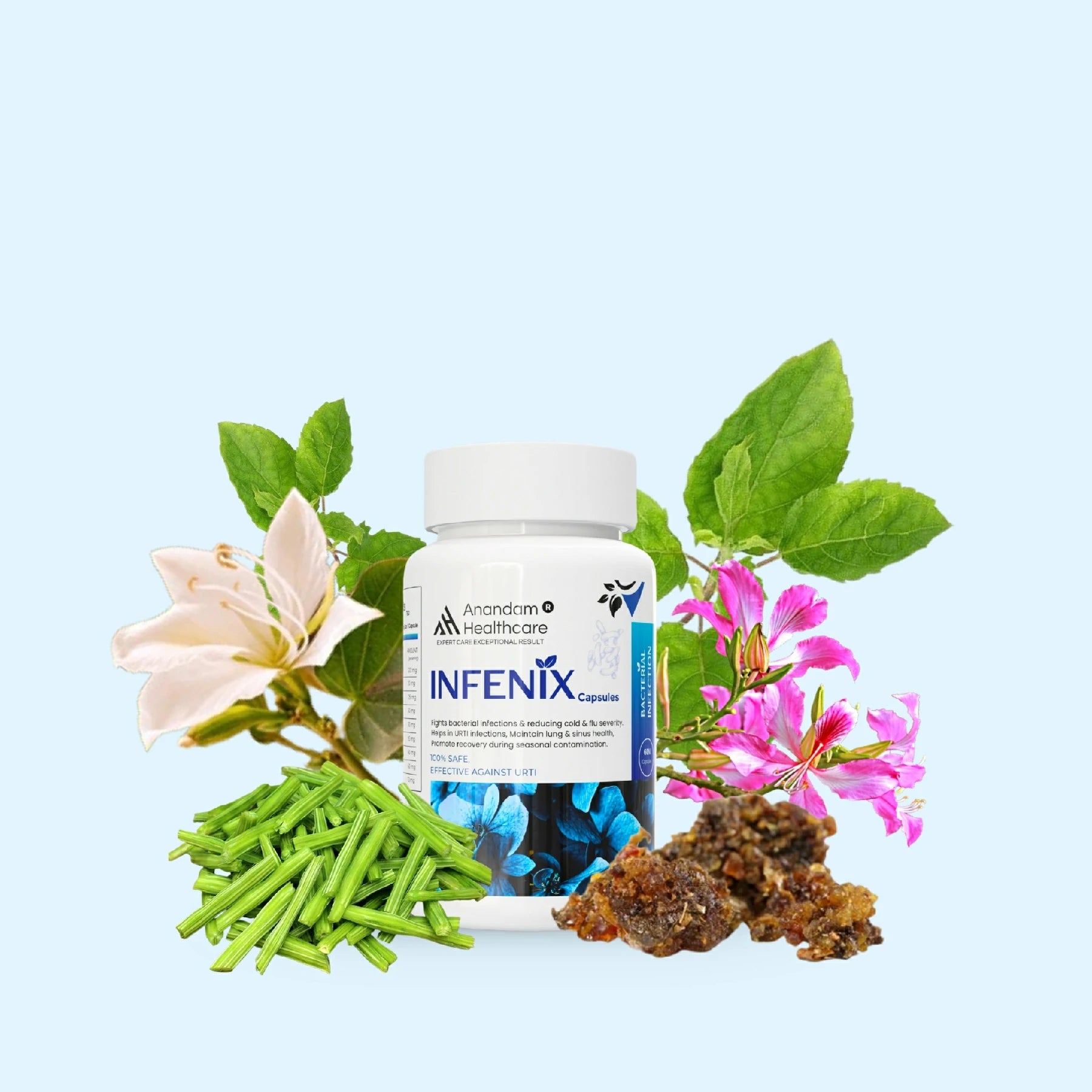 While INFENIX contains powerful antimicrobial herbs like Giloy and Tulsi, it is designed as a preventive and supportive supplement. It should not replace prescribed antibiotics for acute bacterial infections but can be used alongside them to boost recovery and prevent the recurrence of secondary infections.