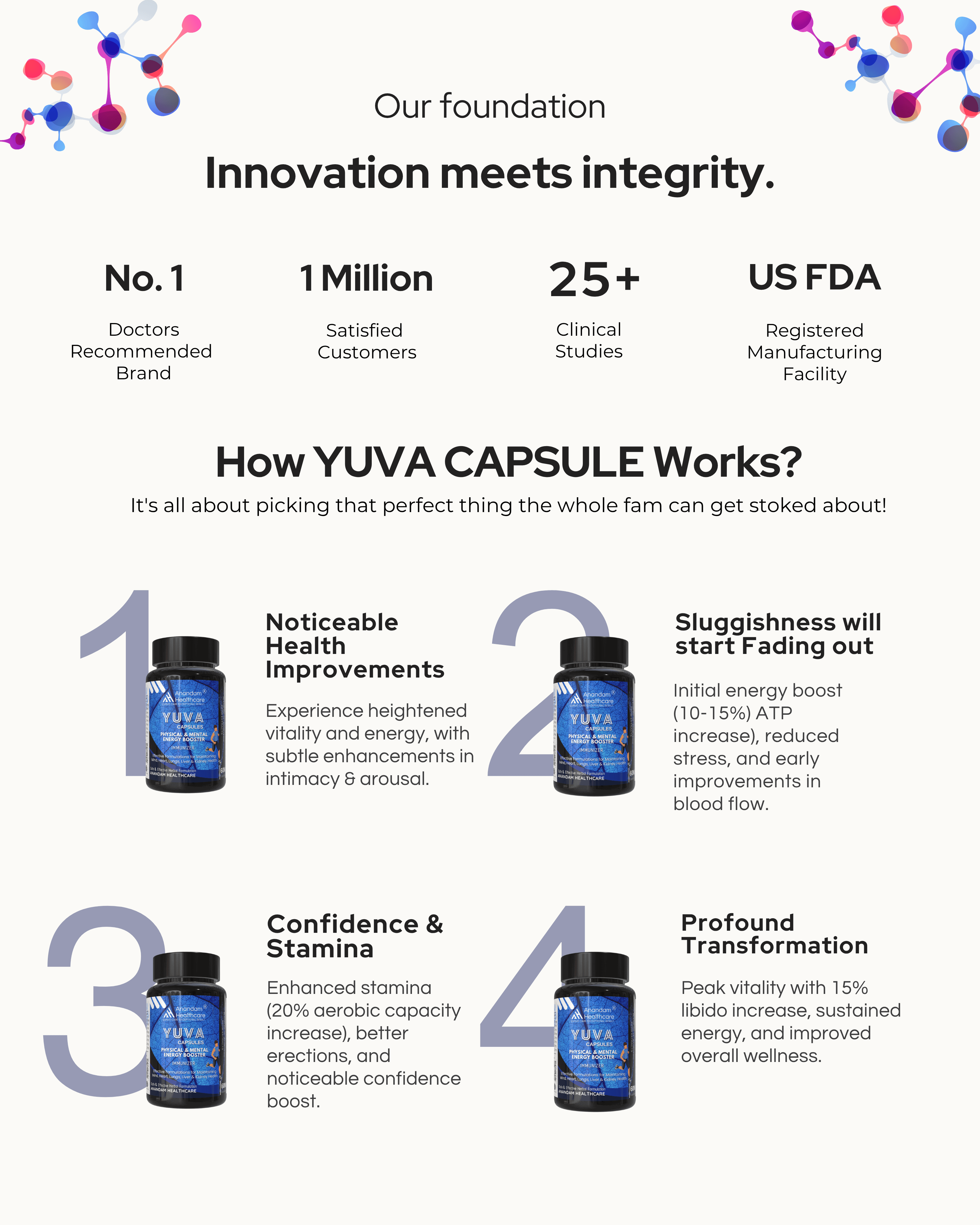 युवा वेगन कैप्सूल, जिसमें अश्वगंधा, लहसुन, मंडुकपर्णी, शंखपुष्पी, वच, गोखरू, शिलाजीत और मुक्ता शुक्ति शामिल हैं।