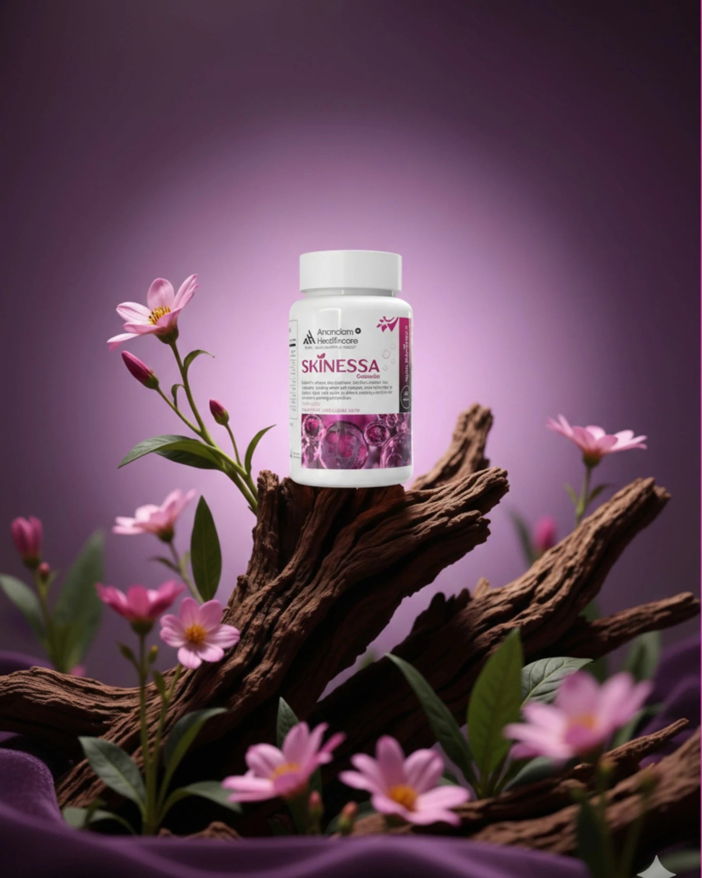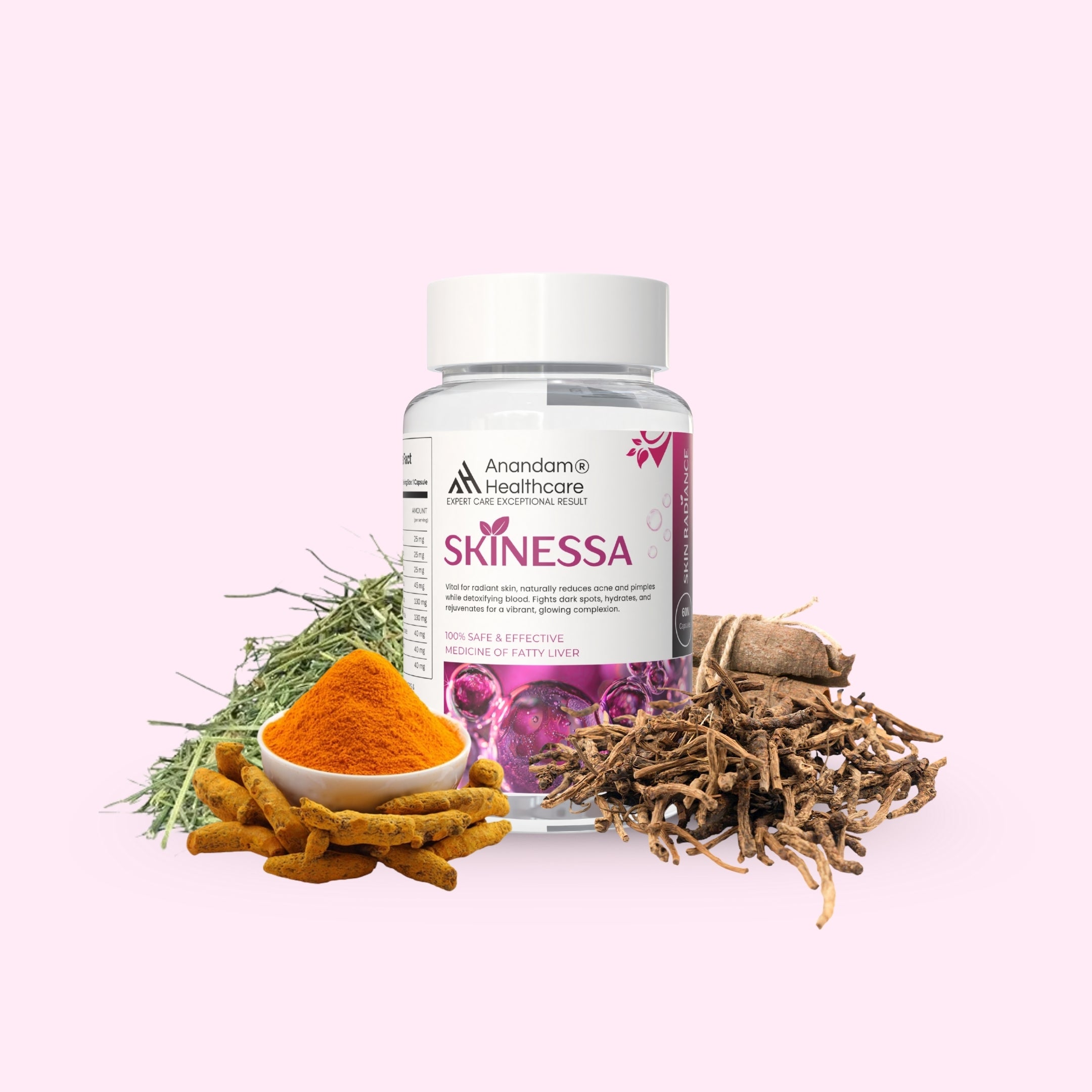 SKINESSA is a targeted Ayurvedic formulation designed to reduce acne, brighten skin tone, and fight pigmentation. It works as an internal detoxifier to purify the blood and hydrate the skin for a naturally radiant and clear complexion.