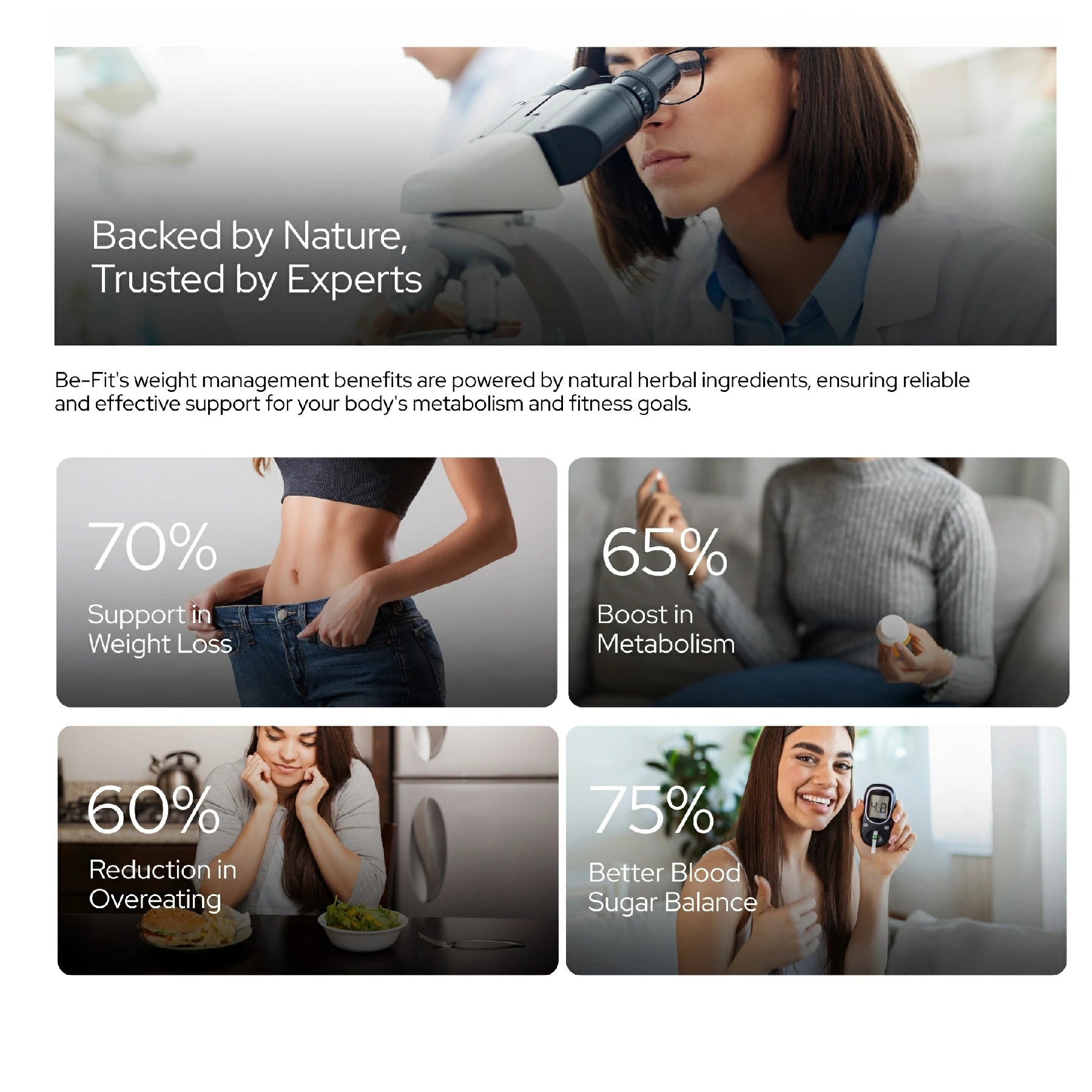 BE-FIT (Slim-Fit) aids weight loss by burning stubborn fat, curbing appetite/cravings, boosting basal metabolism, and supporting natural energy levels and restful sleep.