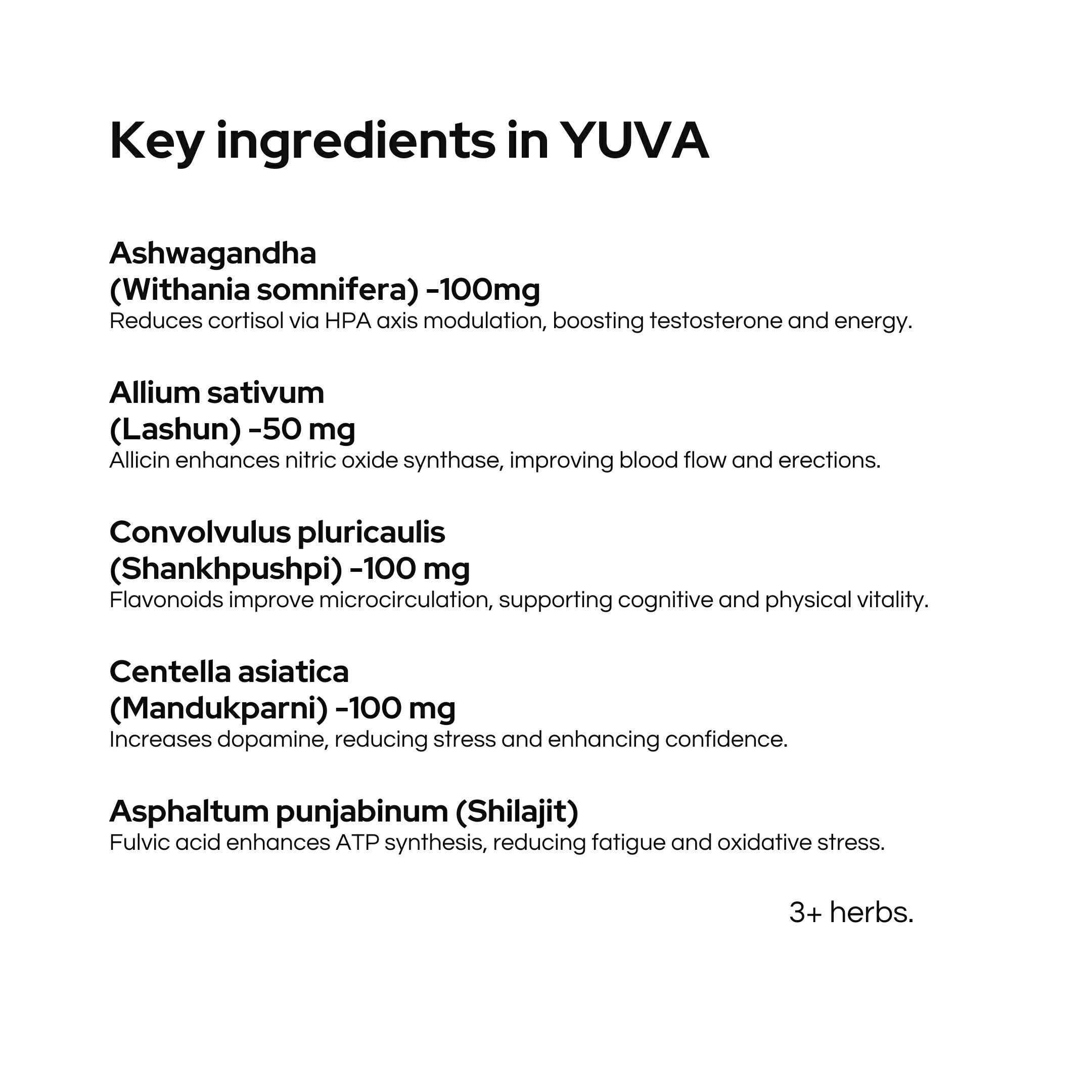 Yuva Capsules promote stress relief, enhance energy levels, and support immune function and skin health. They boost cardiovascular health, improve blood circulation, boost testosterone, and enhance mental clarity.